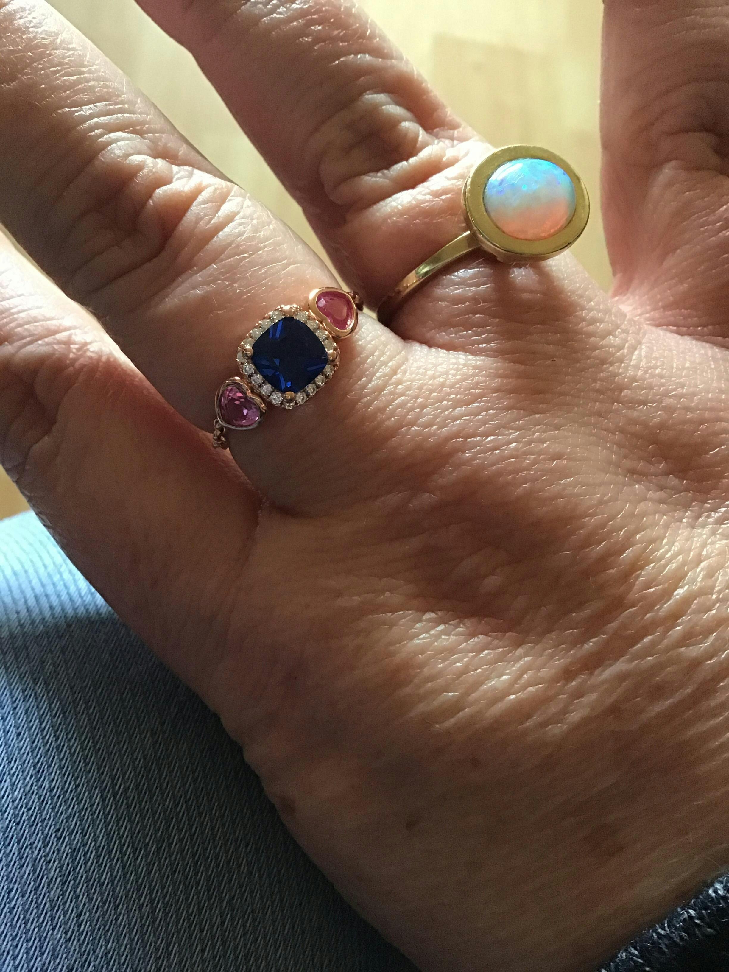 Cette bague ajustable en saphir Bule est en argent sterling plaqué or rose. La pierre principale est un saphir taille coussin 3CT entouré d'un cercle de 16 gemmes rondes. À côté du saphir, il y a deux rubis coupe cœur de 1,5 CT. La couleur est très brillante et belle, et la taille est réglable, vous pouvez le porter quelle que soit la taille de vos doigts.