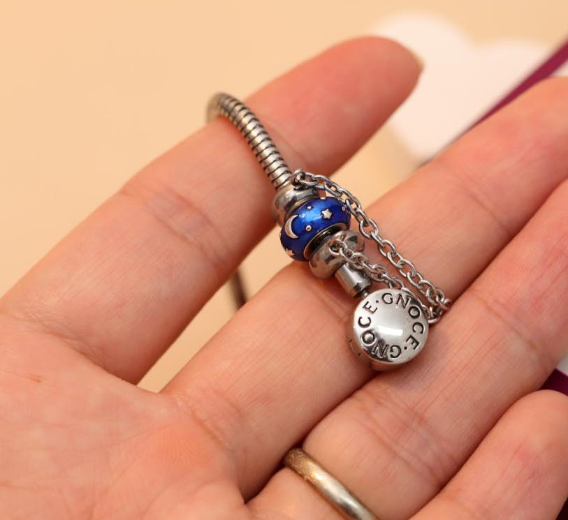 Ce produit est un bouchon de bracelet qui maintient vos charms en place. Les petites étoiles clignotent dans le ciel nocturne, la lune les accompagne silencieusement, et une belle carte des étoiles est imprimée sur cet petit espaceur, au Charm infini.